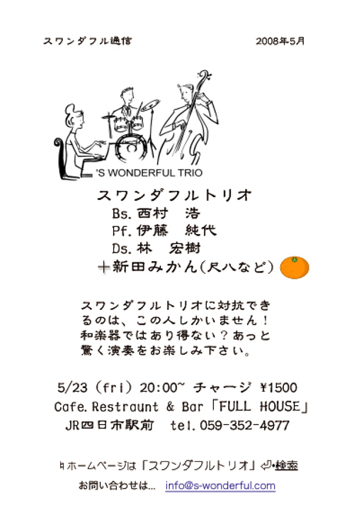 23日(金) 20 : 00 フルハウスライブ「スワンダフルトリオ+ゲスト新田みかん(尺八など)」