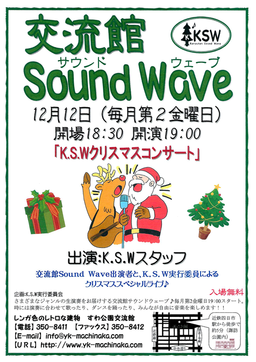 「交流館サウンドウェーブ」のクリスマスコンサートは、K.S.W.スタッフと、今までご出演戴いたバンドの皆さんの参加によるクリスマススペシャルライブです。もちろんお客様参加戴型の和気あいあいコンサートとなります。皆様是非ご参加下さい。予定出演者[MACK.イブニンググロー.ヘッドライン.スワンダフルトリオ.MIKIKO(vo).服部恵美.小林康史...etc]