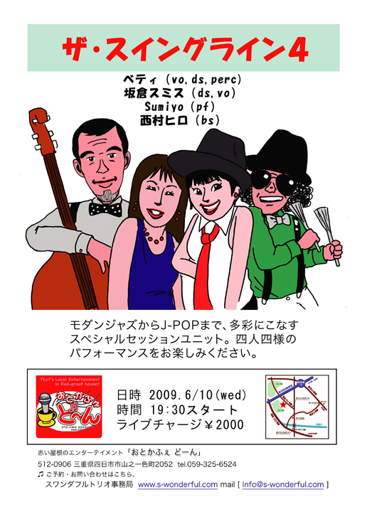 10日(水) 19 : 30 「ザ・スイングライン4」待望のライブ。 四日市「おとかふぇどーん」