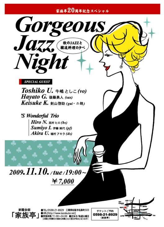 2009.11/10.19:00~ 松阪家族亭で行われます。予約が必要です。¥7000のチケットをお買い求め下さい。出演 牛嶋としこ(vo)後藤勇人(sax)剣山啓助(gui.二胡)スワンダフルトリオ.西村ヒロ(bs)伊藤純代(pf)植村アキラ(ds)