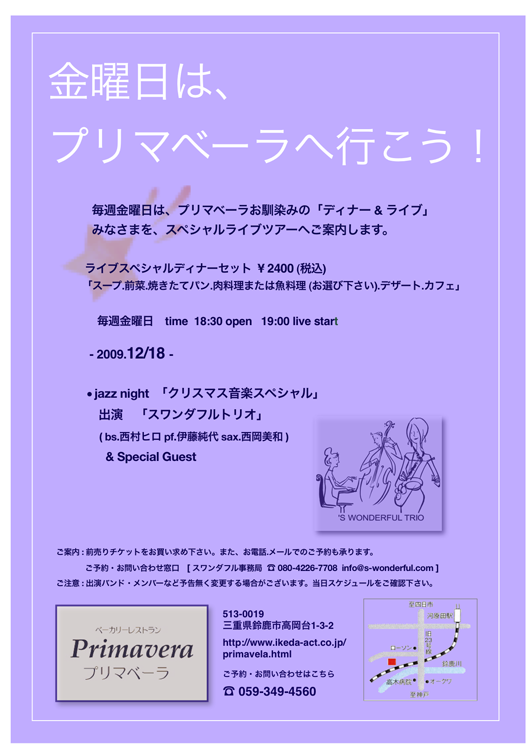 ベーカリーレストラン「プリマベーラ」毎週金曜日「ディナー&ライブ」のご案内。