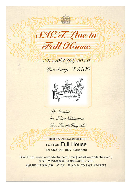 8日(金) 20 : 00 四日市フルハウスライブ「スワンダフルトリオ」