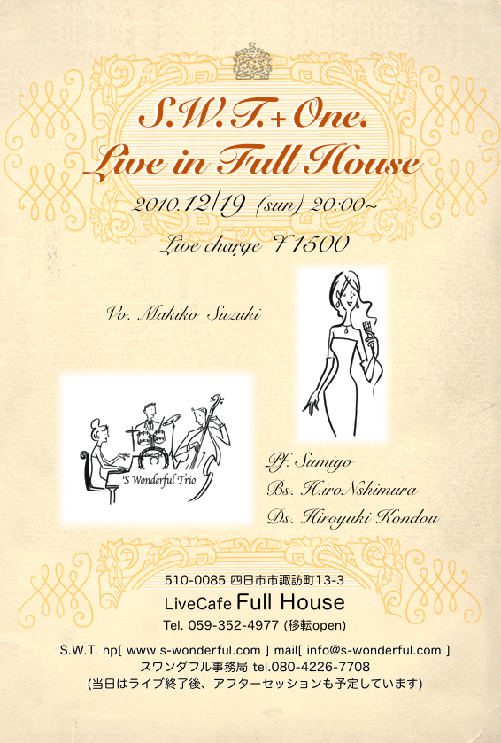 19日(日) 20 : 00 四日市フルハウスライブ「スワンダフルトリオ+ボーカル」