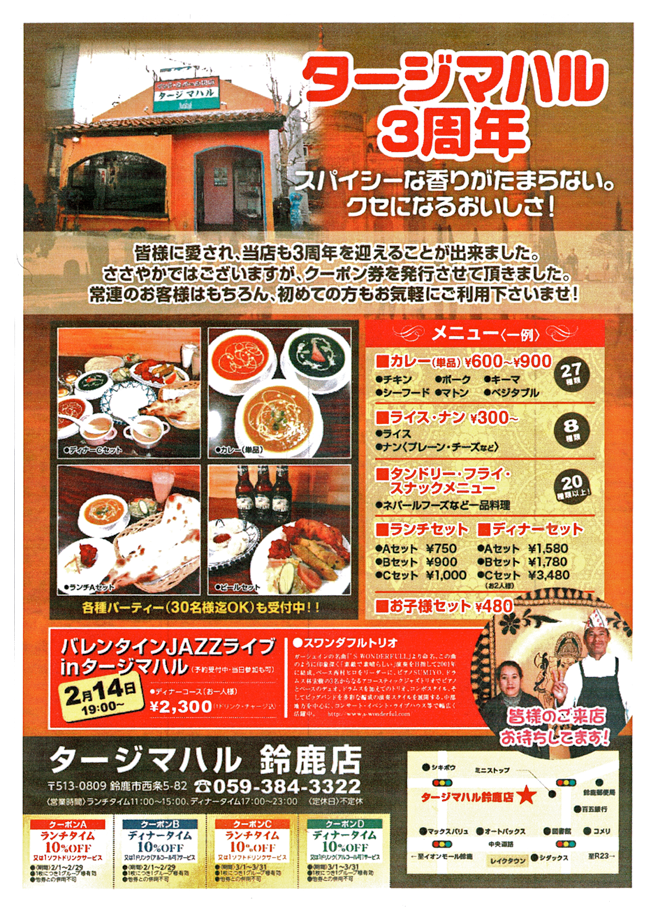 14日(火) 19 : 00 鈴鹿「タージマハル」3周年記念スペシャル企画