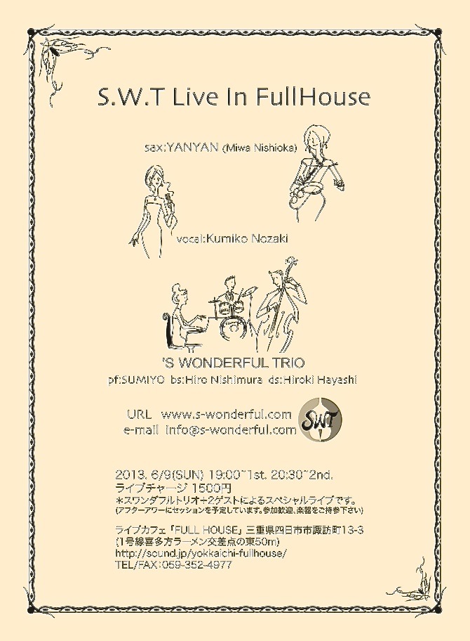 久しぶりにフルハウス、S.W.T.+2ゲストによるスペシャルライブです。 アフターアワーセッションも予定していますので演奏で参加の方も大歓迎です。出演:スワンダフルトリオ+sax.西岡美和/vocal.野崎久美子