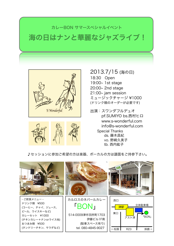 15日(月) 19 : 00 「BON」サマーイベント 海の日スペシャルジャズライブ