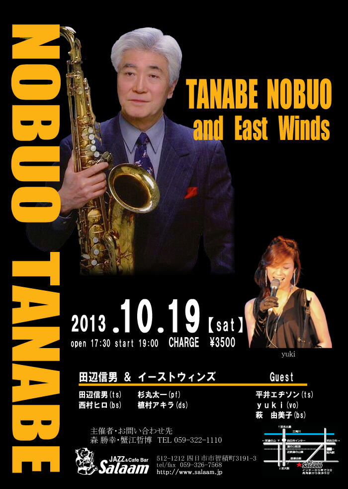 田辺信男&イーストウィンズ 四日市サラームライブ 田辺信男(ts)杉丸太一(pf)西村ヒロ(bs)植村アキラ(ds)ほか、、。チャージ3000円