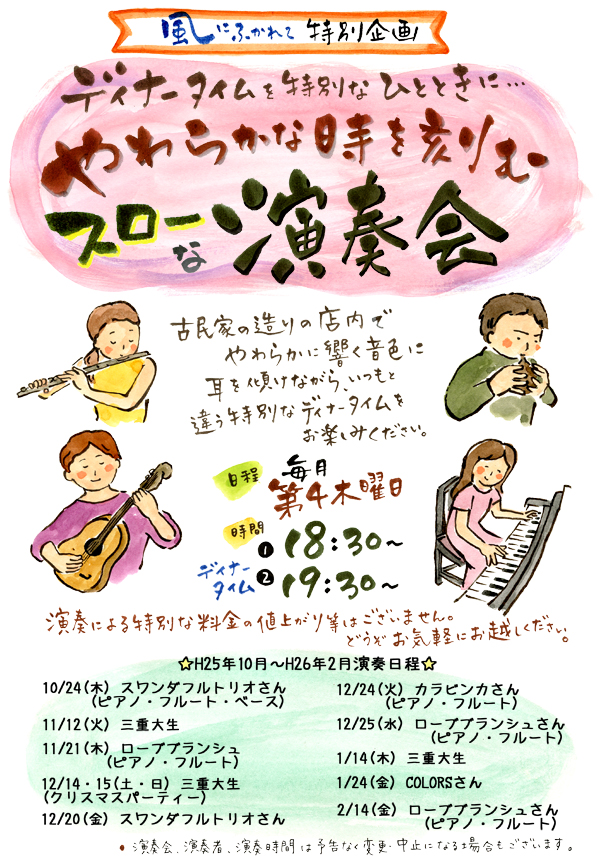 20日(金) 18 : 30 モクモク直営レストランの特別企画「風にふかれて演奏会」スワンダフルトリオ