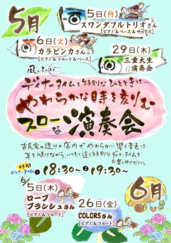 5日(月) 18 : 30 モクモク直営レストランの特別企画「風にふかれて演奏会」スワンダフルトリオ