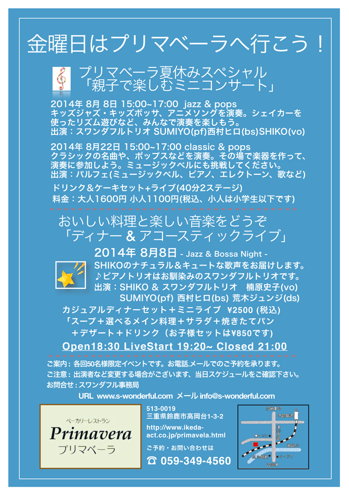 22日(金) 15 : 00 金曜日はプリマベーラへ行こう!夏休みスペシャル企画 (アフタヌーンライブ)