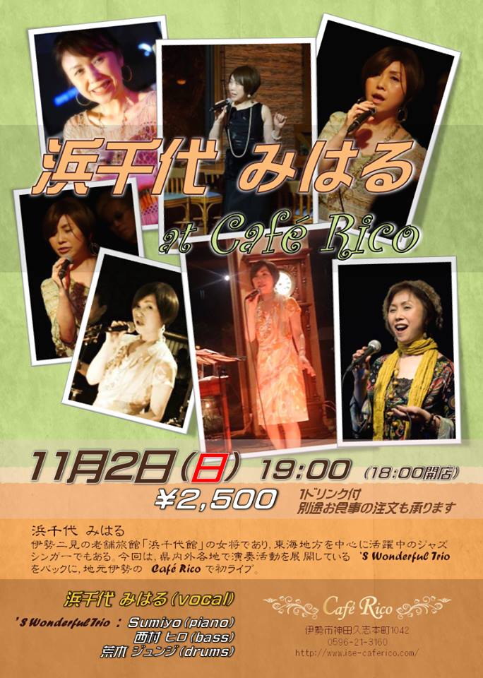 2日(日) 19 : 00 伊勢市「カフェ リコ」浜千代美治+スワンダフルトリオ