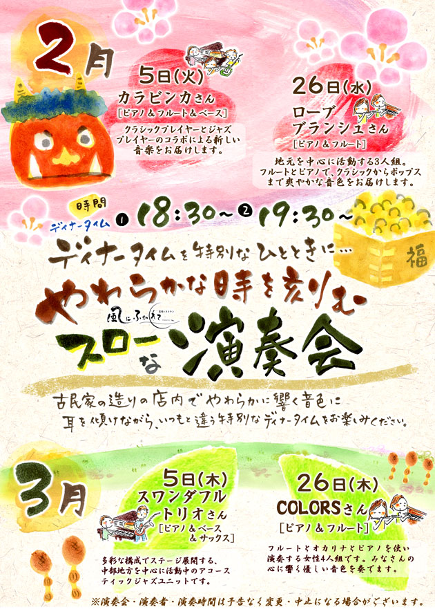 5日(木) 18 : 30 モクモク直営レストランの特別企画「風にふかれて演奏会」カラビンカ(クラシック)