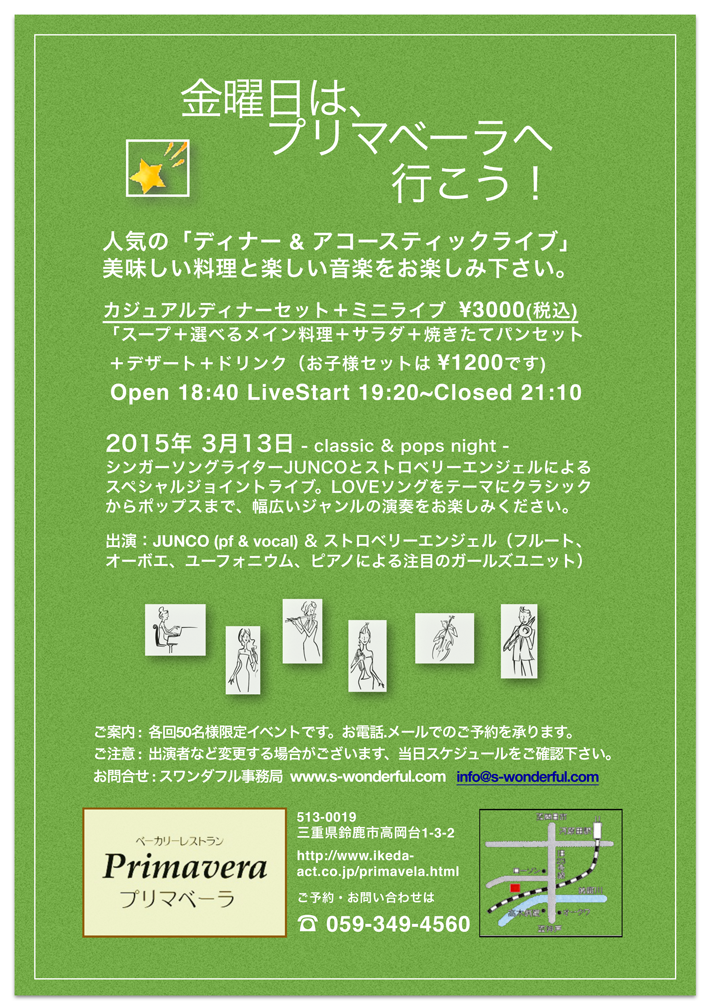 金曜日はプリマベーラへ行こう「ディナー&ライブ」JUNCO & ストロベリーエンジェル