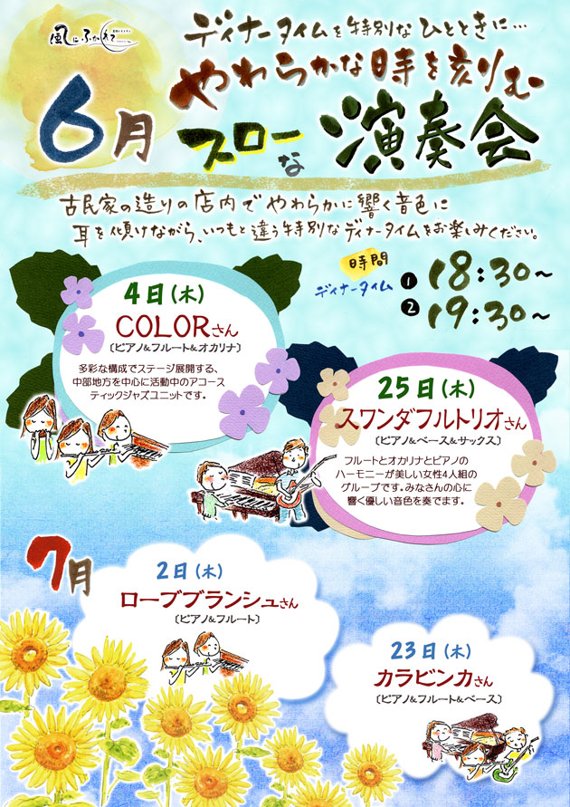 25日(木) 18 : 30 モクモク直営レストランの特別企画「風にふかれて演奏会」スワンダフルトリオ