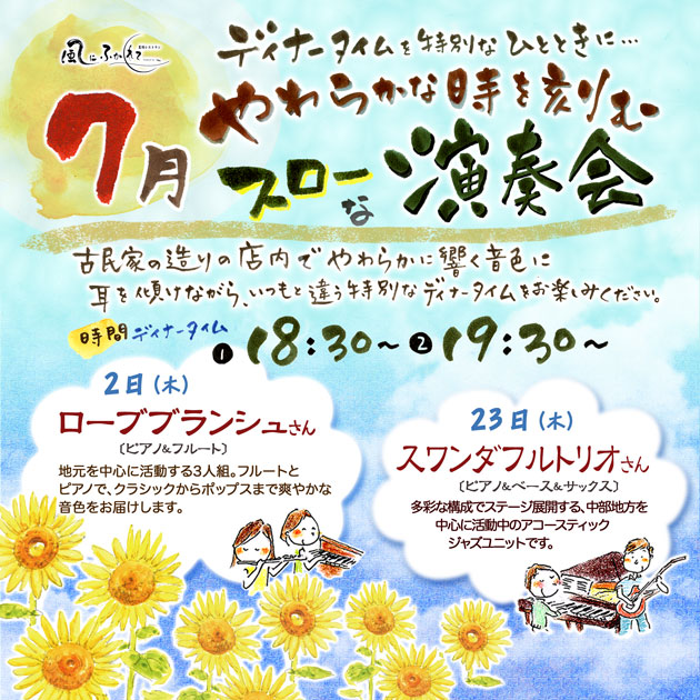 23日(木) 18 : 30 モクモク直営レストラン「風にふかれて演奏会」スワンダフルトリオ