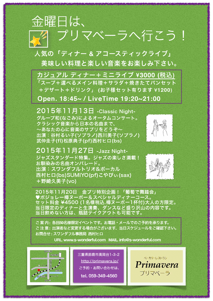 13日(金) 18 : 45 金曜日はプリマベーラへ行こう「ディナー&ライブ