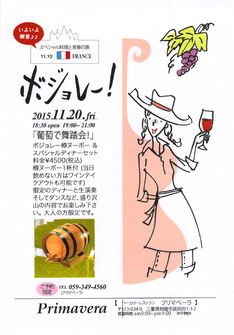 20日(金) 18 : 45 金曜日はプリマベーラへ行こう「ボジョレーヌーボースペシャル