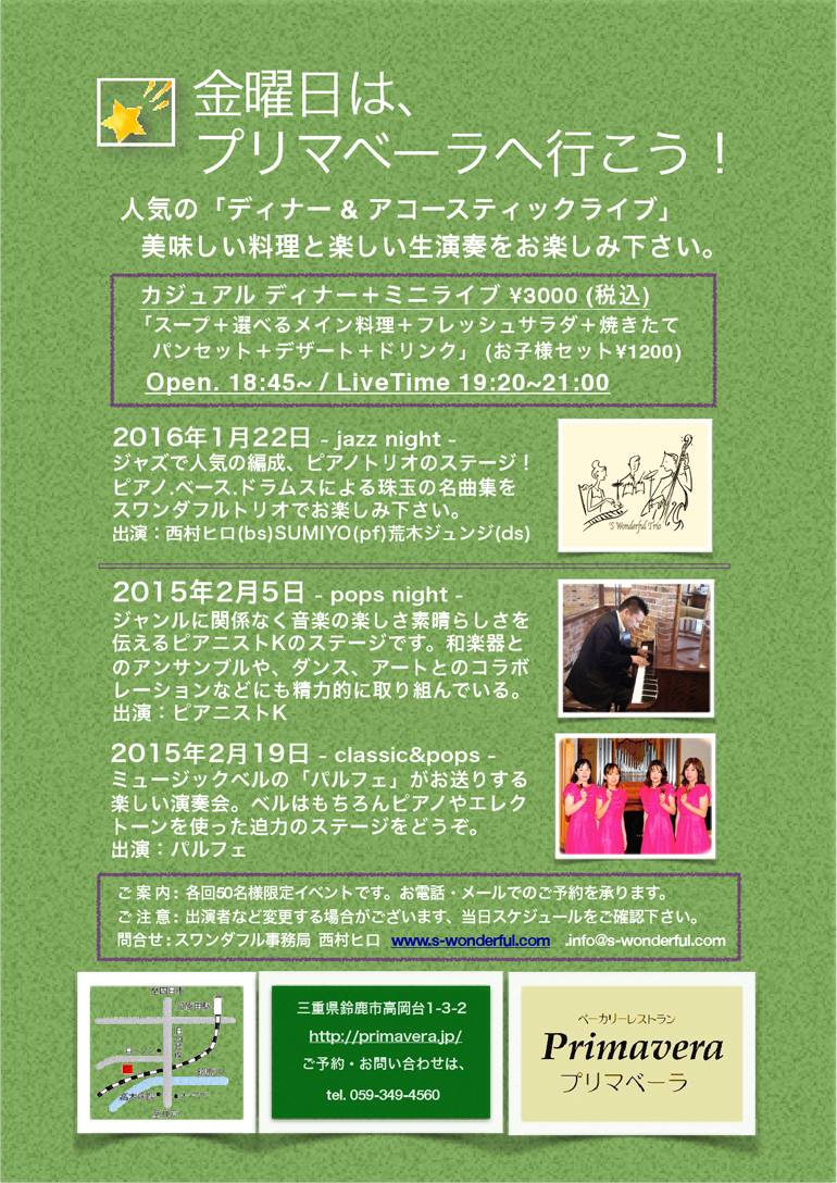 金曜日はプリマベーラへ行こう「ディナー&ライブ」スワンダフルトリオ