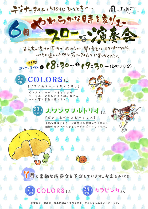 23日(木) 18 : 30 モクモク直営レストラン「風にふかれて演奏会」スワンダフルトリオ