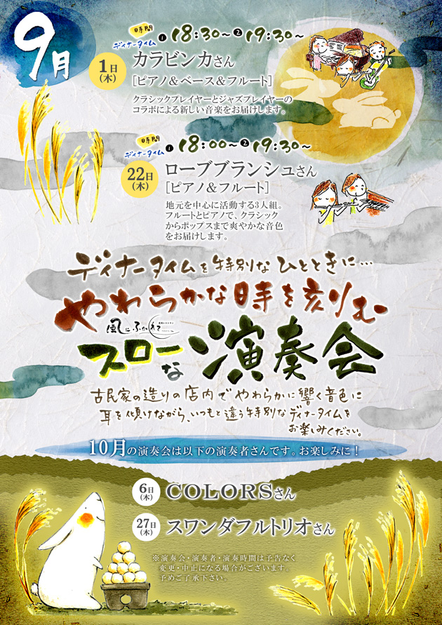 27日(木) 18 : 30 モクモク直営レストランの特別企画「風にふかれて演奏会」スワンダフルトリオ