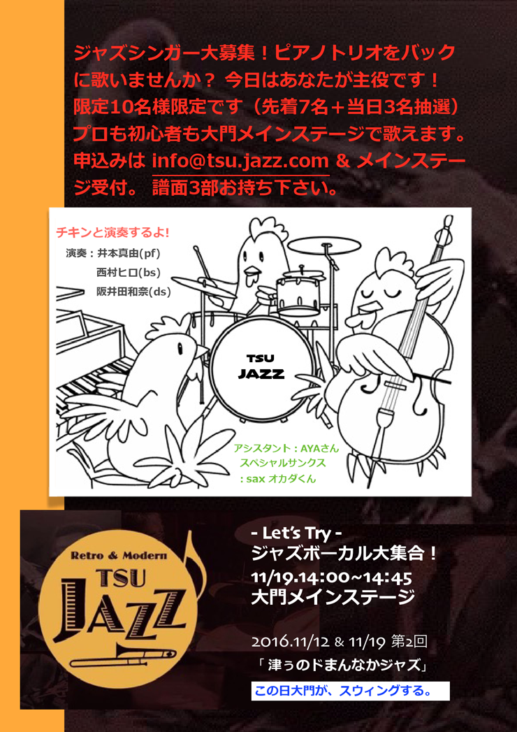 19日(土) 14 : 00 津ぅのどまんなかジャズ 2nd..2016 Let's Try ジャズボーカル大集合!