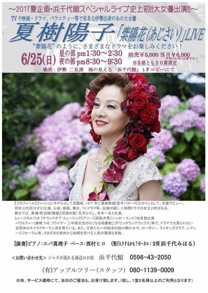 25日(日) 12 : 00 伊勢二見の浜千代館 夏樹陽子「あじさい」LIVE