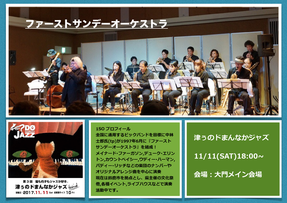 11日(土) 18 : 00 津ぅのドまんなかジャズ 「ファーストサンデーオーケストラ」