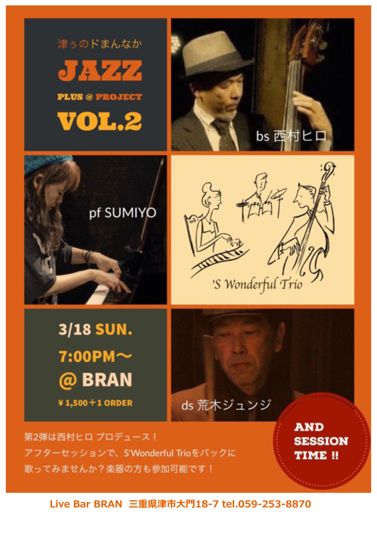 18日(日) 19 : 00 津市大門BRANスワンダフルトリオライブ 津ぅのドまんなかジャズ PLUS@PROJECT