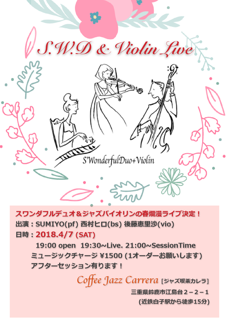 7日(土) 19 : 30 鈴鹿カレラライブ「スワンダフルトリオ」(vio&pf&bs)