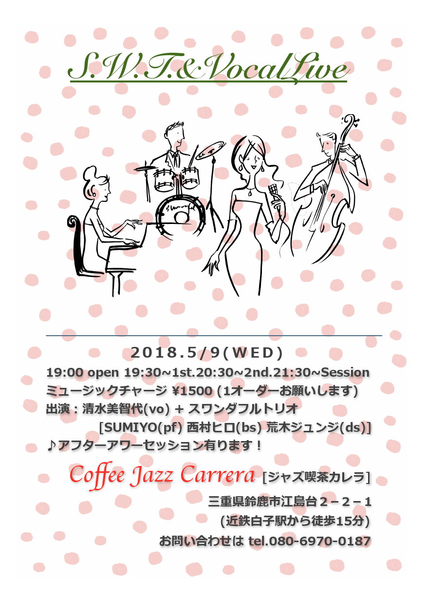 9日(水) 19 : 30 鈴鹿カレラライブ「スワンダフルトリオwithボーカル」
