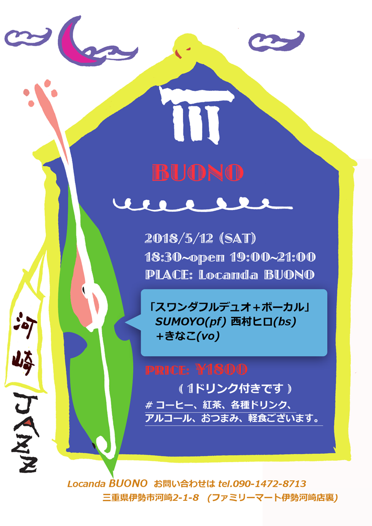 12日(土) 19 : 00 伊勢河崎のイタリアン「ボーノ」JAZZ LIVE「スワンダフルデュオ&ボーカル」