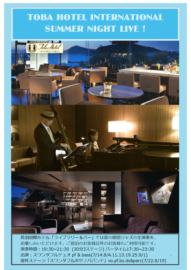 1日(土) 19 : 30 鳥羽国際ホテル「サマータイム・ジャズ演奏」ライブラリ&バー