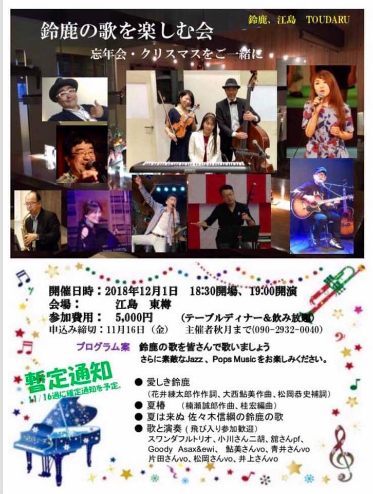 1日(土) 19 : 00 鈴鹿の歌を楽しむ会!白子「東樽」