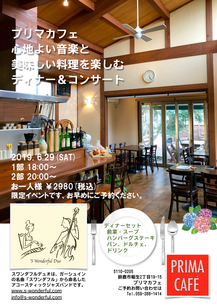 29日(土) 18 : 00 プリマカフェ 「ディナー&コンサート」「スワンダフルデュオ」鈴鹿市