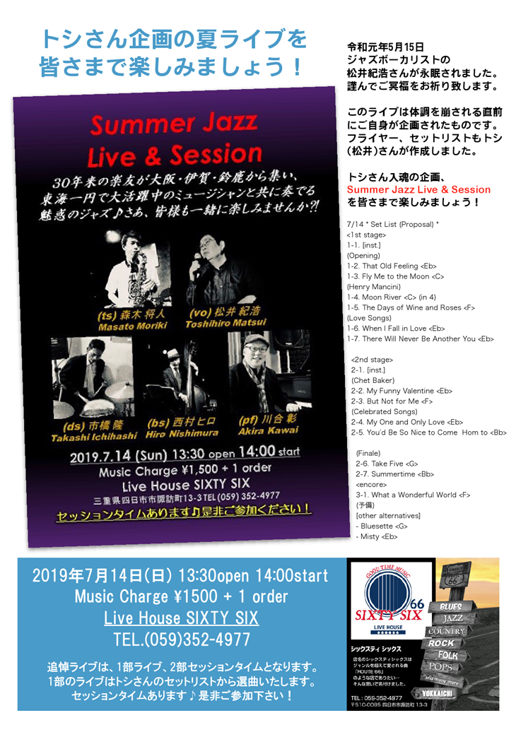 14日(日) 14 : 00 四日市SixtySix 「Summer Jazz Live & Session」松井紀浩プロデュース