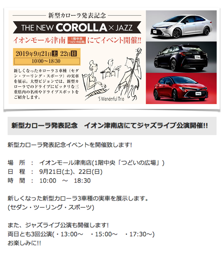 22日(日) 13 : 00 イオン津南「TOYOTA新型カローラ発表記念イベント」