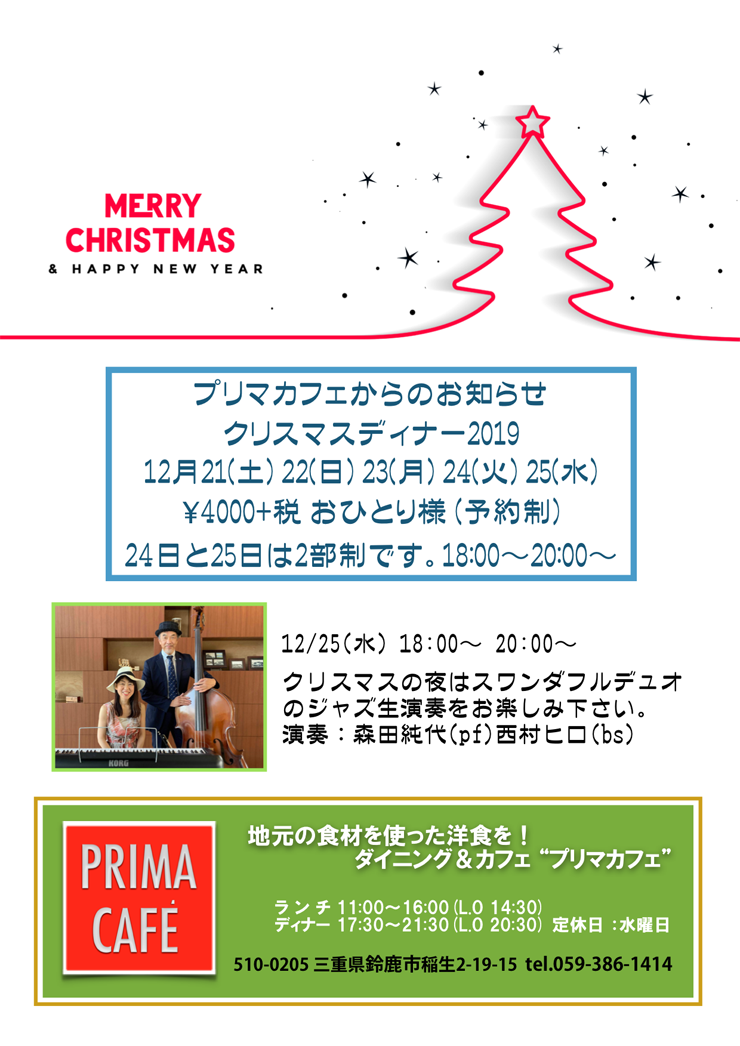25日(水) 18 : 00 鈴鹿プリマカフェ「クリスマスディナー&ライブ」